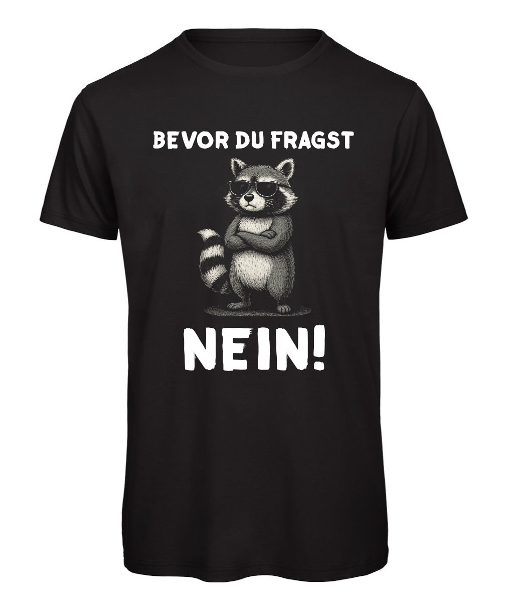 Das T-Shirt mit dem Kult-Spruch „Bevor du fragst: Nein“ und frechem Waschbär-Motiv ist ein humorvoller Hingucker für jeden Tag. Hochwertiger, langlebiger Druck auf weichem, angenehmem Stoff. Moderner Unisex-Schnitt, bequem, pflegeleicht und ideal als Geschenk für Menschen mit trockenem Humor. Ein Shirt, das die Antwort liefert – bevor jemand fragt. Witzig, klar, unverwechselbar.