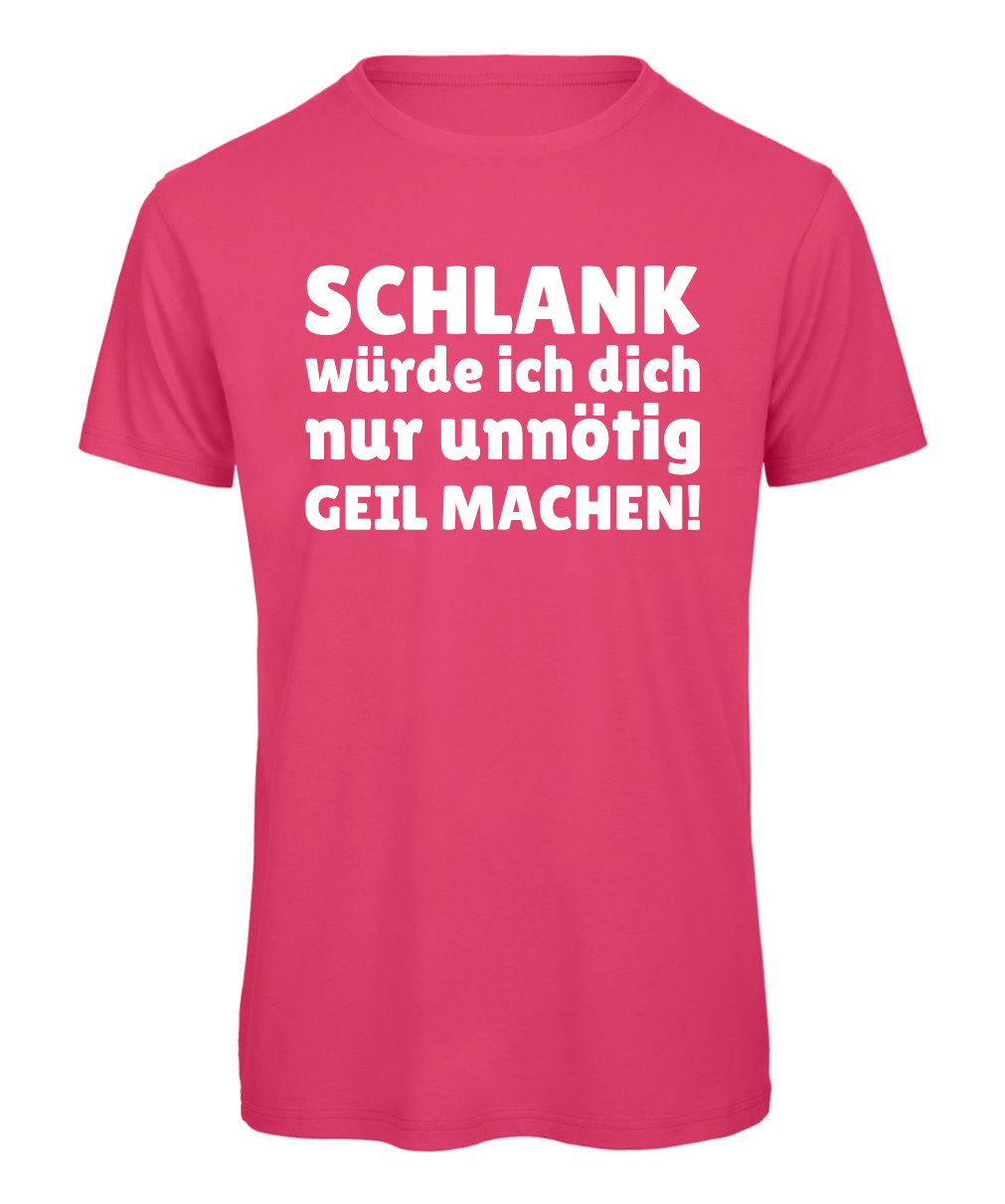 Dieses Herren T-Shirt sorgt garantiert für Lacher. Der freche Spruch „Schlank würde ich dich nur unnötig geil machen“ macht das Shirt zum perfekten Funshirt für Partys, Geburtstage oder entspannte Abende mit Freunden. Der bequeme Schnitt und das angenehme Material sorgen für hohen Tragekomfort im Alltag. Ideal als witziges Geschenk oder für alle, die Humor zeigen wollen und gerne auffallen. Ein lustiges Statement-Shirt, das sofort für Gesprächsstoff sorgt.